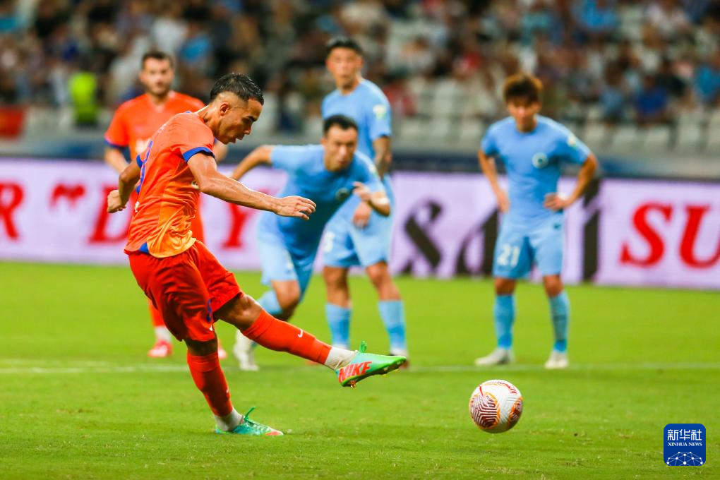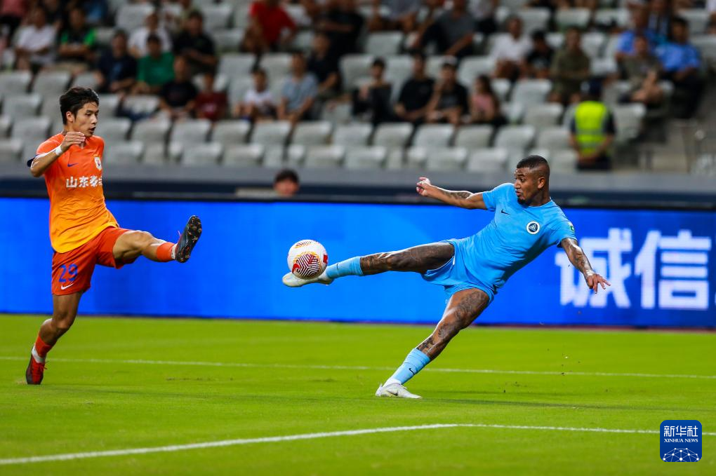 9月28日,深圳新鹏城队球员蒂亚戈(右)在比赛中射门。