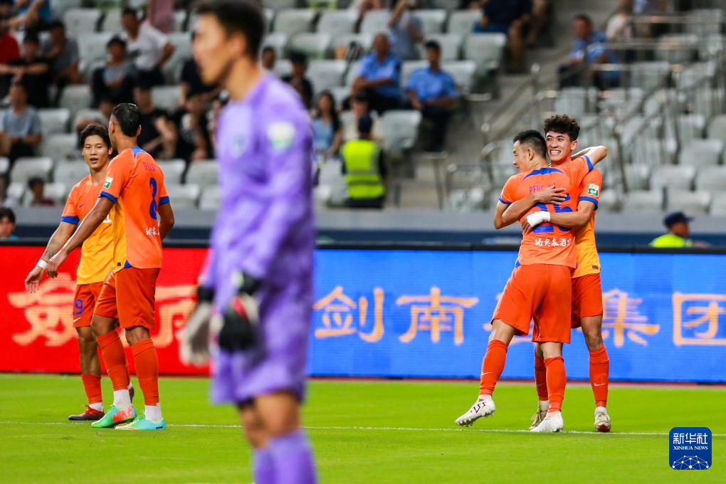 9月28日,深圳新鹏城队球员在比赛中庆祝进球。