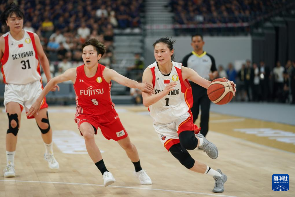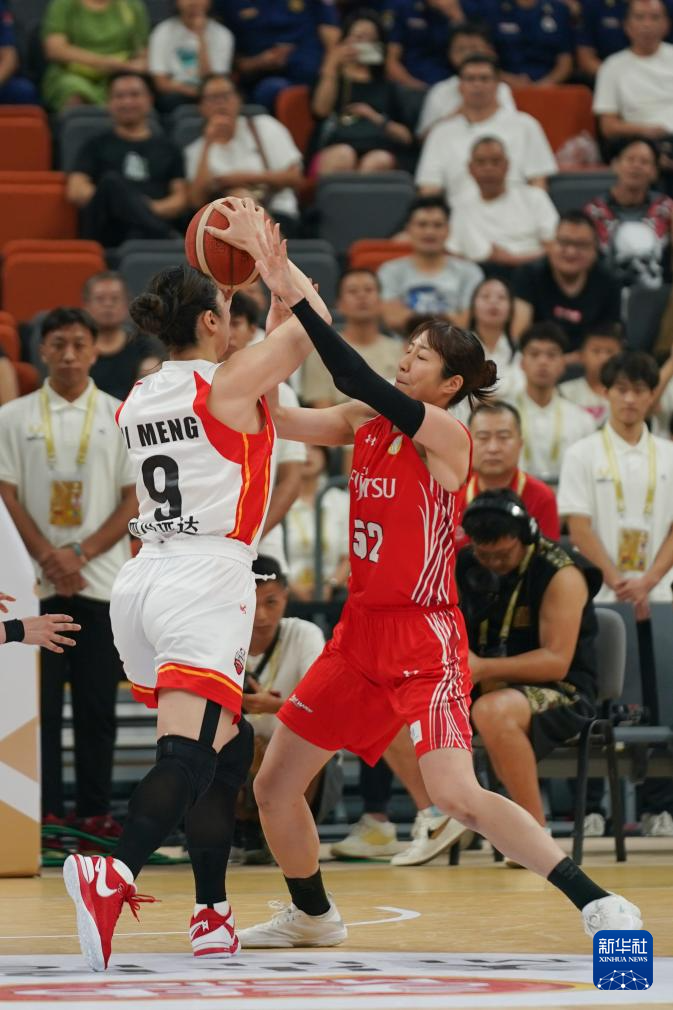 9月28日,中国四川远达美乐队球员金维娜(右)和日本富士通红浪队球员约书亚·恩冯诺邦·特米托佩在比赛中拼抢。