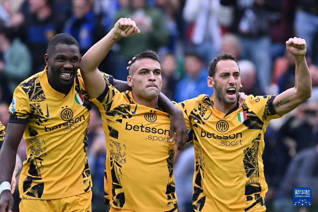 9月28日,国际米兰队球员劳塔罗·马丁内斯(中)进球后与队友图拉姆(左)、恰尔汗奥卢庆祝。