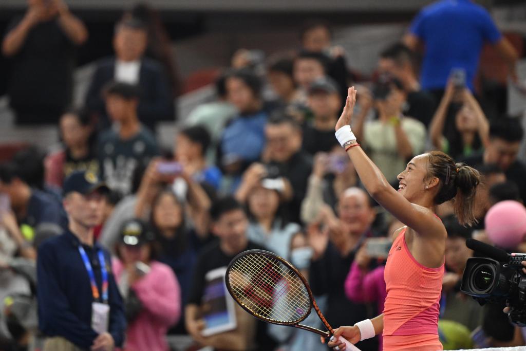 9月28日,郑钦文在赛后向观众致意。当日,在北京进行的2024中国网球公开赛女单第二轮比赛中,中国选手郑钦文2:0战胜俄罗斯选手拉希莫娃,晋级下一轮。新华社记者 张龙 摄
