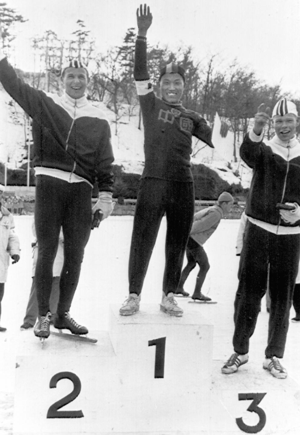 1963年2月24日,在日本举行的世界速度滑冰锦标赛中,罗致焕获得男子1500米项目冠军。这是中国运动员第一次取得冰雪项目的单项世界冠军。图为罗致焕(中)受奖后向观众致意。 新华社发(资料照片)