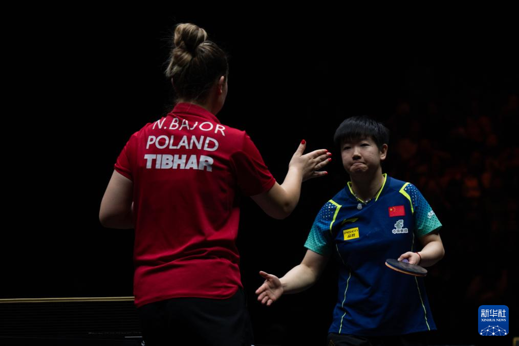 9月29日,中国选手孙颖莎(右)在赛后向波兰选手娜塔莉亚·巴约致意。