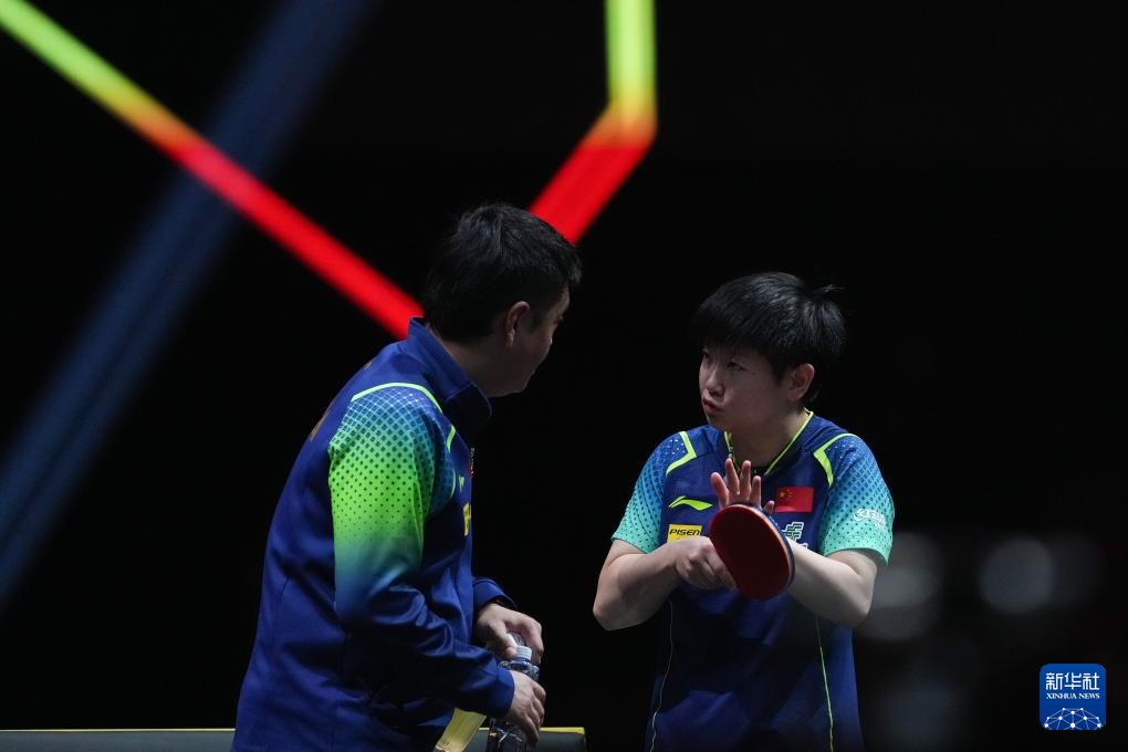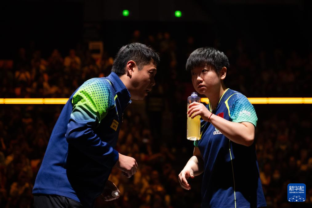 9月29日,中国选手孙颖莎(右)在比赛中与教练交流。