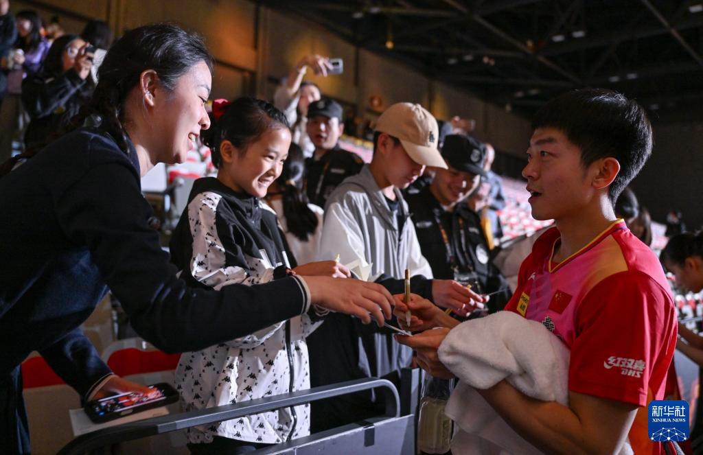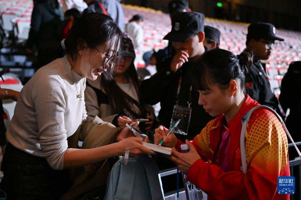 10月1日,石洵瑶(右)在比赛后为观众签名。
