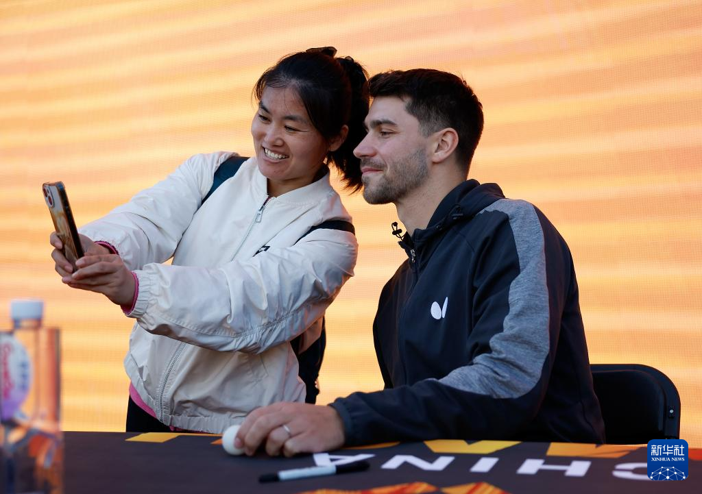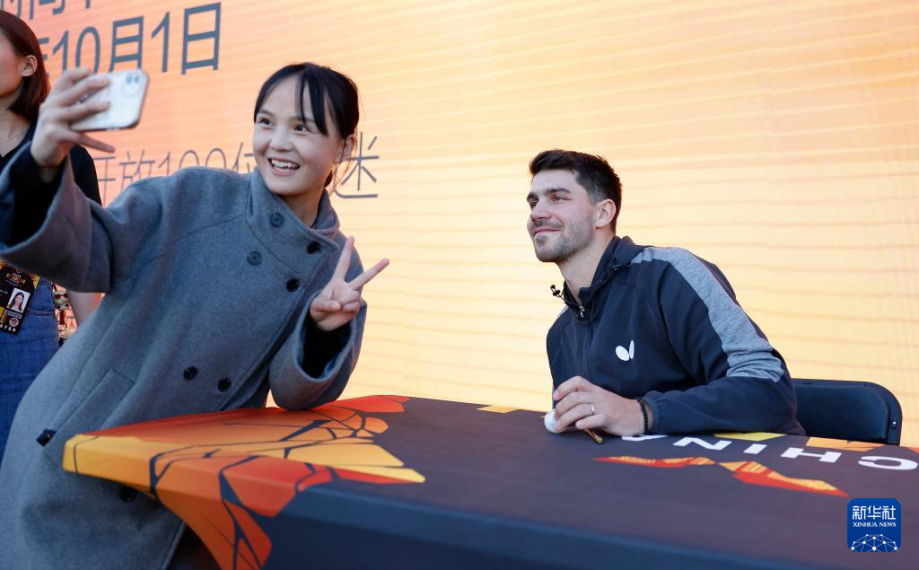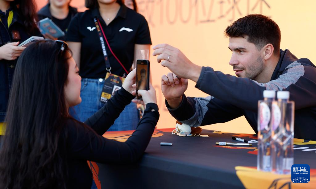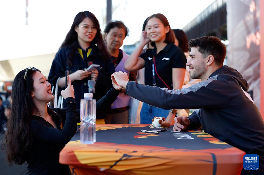 10月1日,德国球员帕特里克·弗朗西斯卡(右)在大满贯公园举行的球员见面会上为球迷签名。