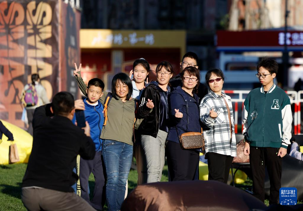 10月1日,球迷在比赛场外留影。