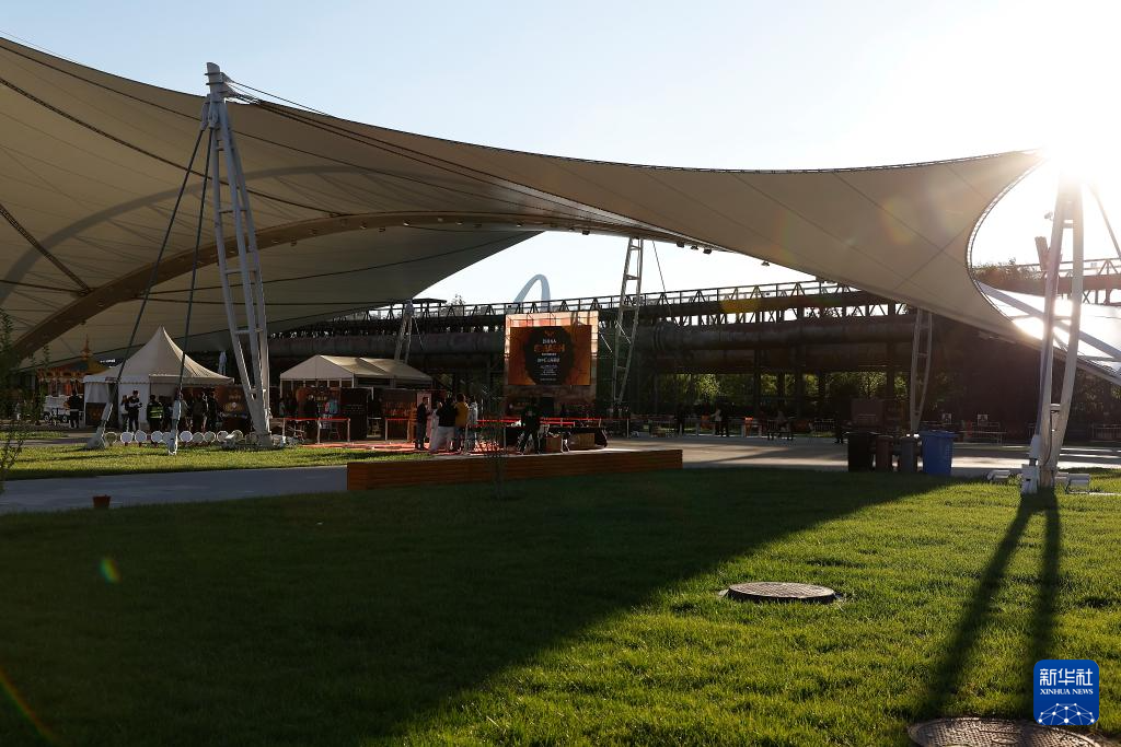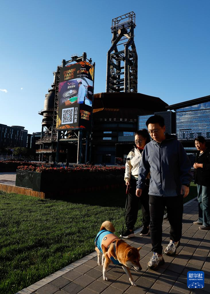 10月1日,一家人从大满贯公园外的首钢国际会展中心前走过。