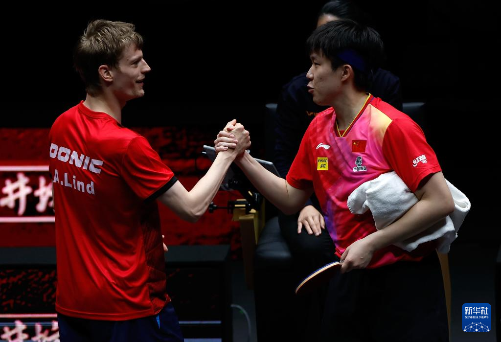 10月1日,王楚钦(右)在赛后与安德斯·林德致意。