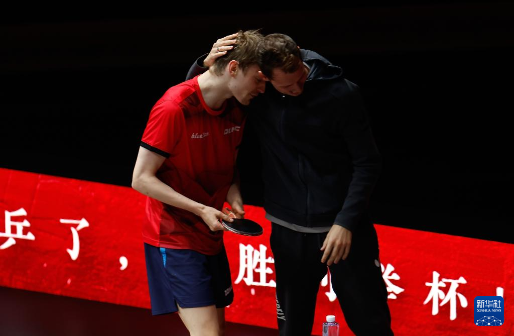 10月1日,王楚钦(左)与安德斯·林德(中)在比赛后,王皓在教练席等候王楚钦。