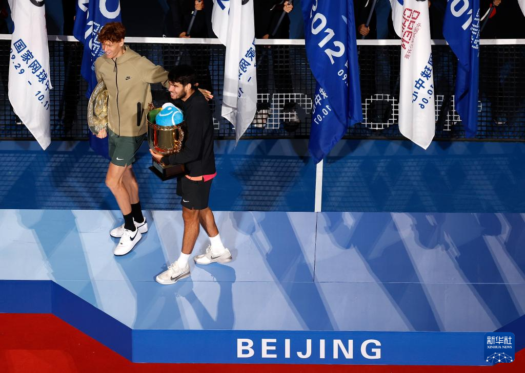 10月2日,冠军阿尔卡拉斯(左)与亚军辛纳在颁奖仪式上。