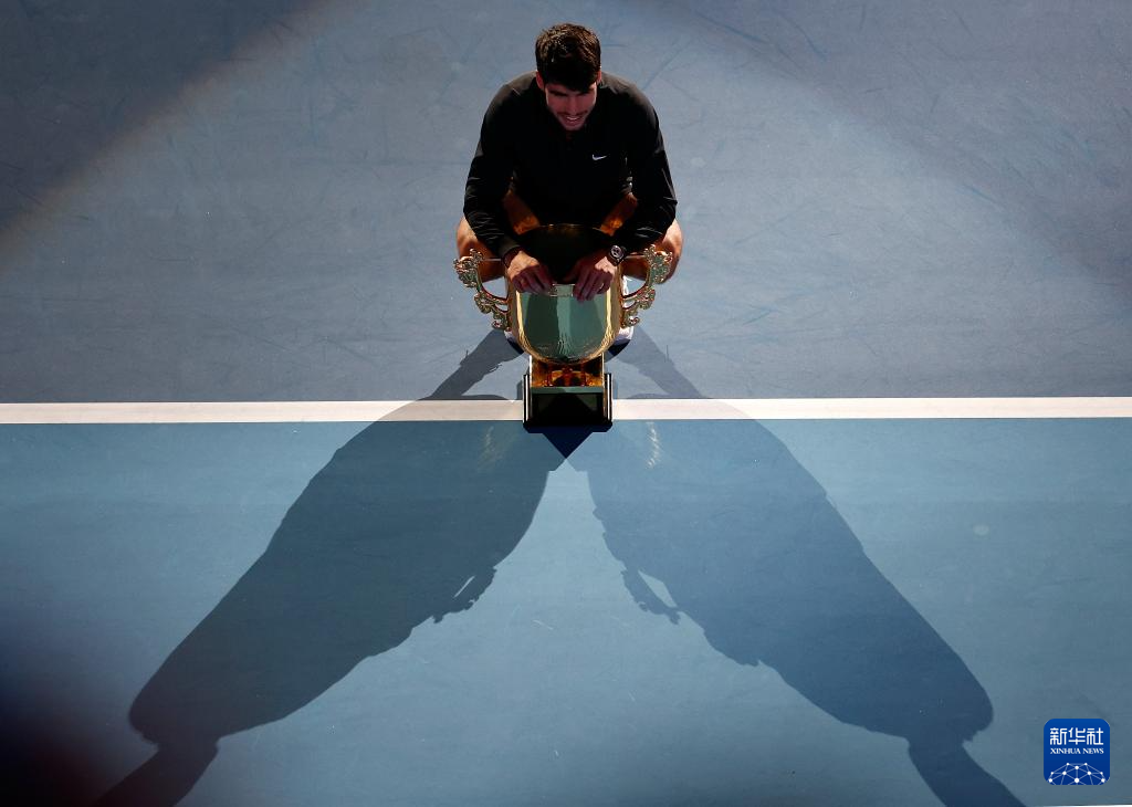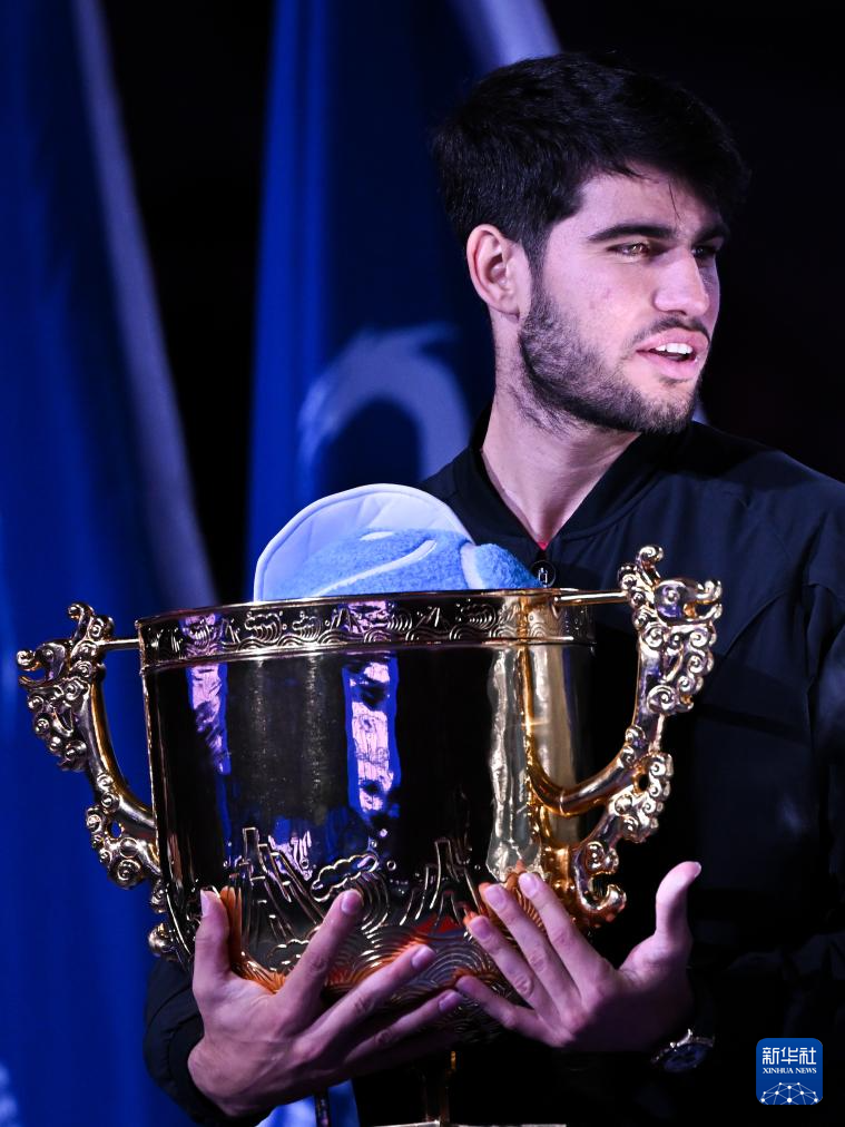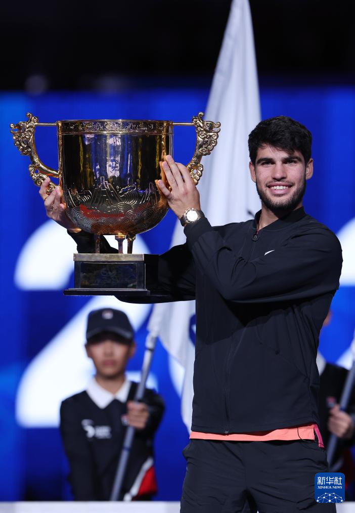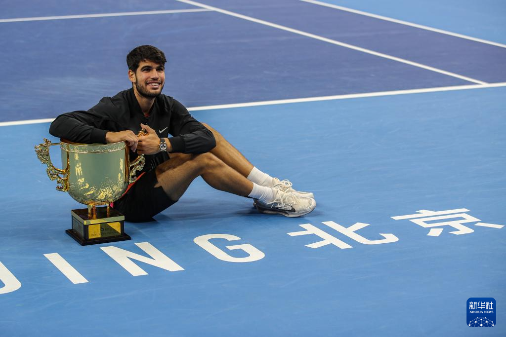 10月2日,阿尔卡拉斯在颁奖仪式后与奖杯合影。