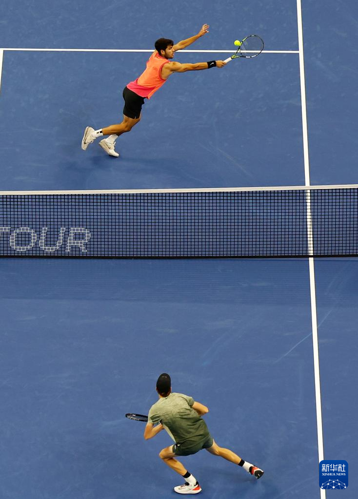 10月2日,阿尔卡拉斯(上)在比赛中回球。