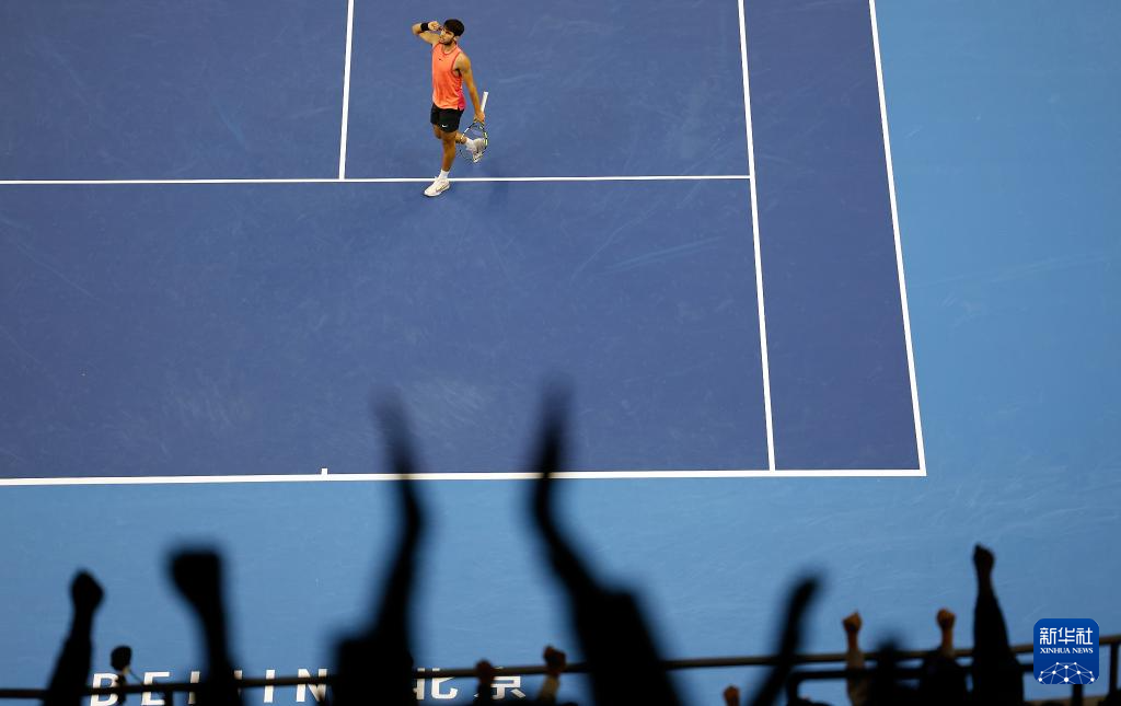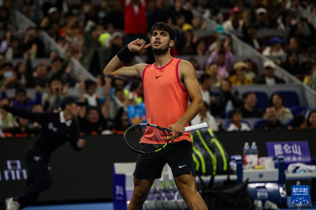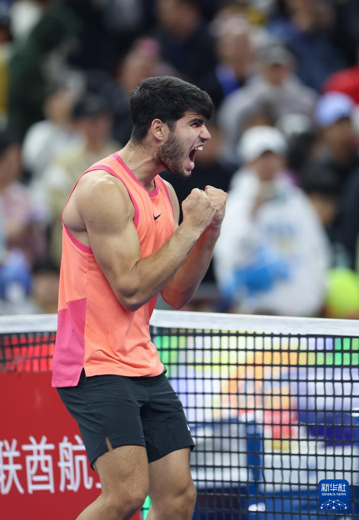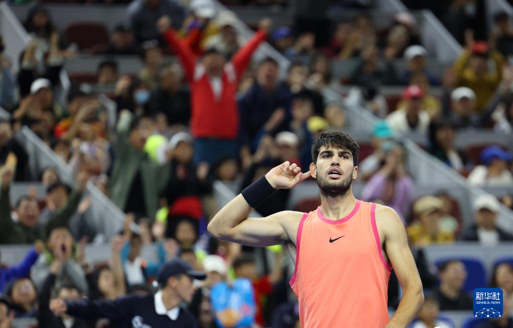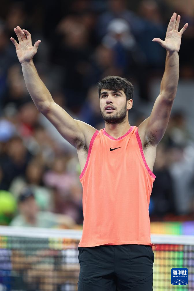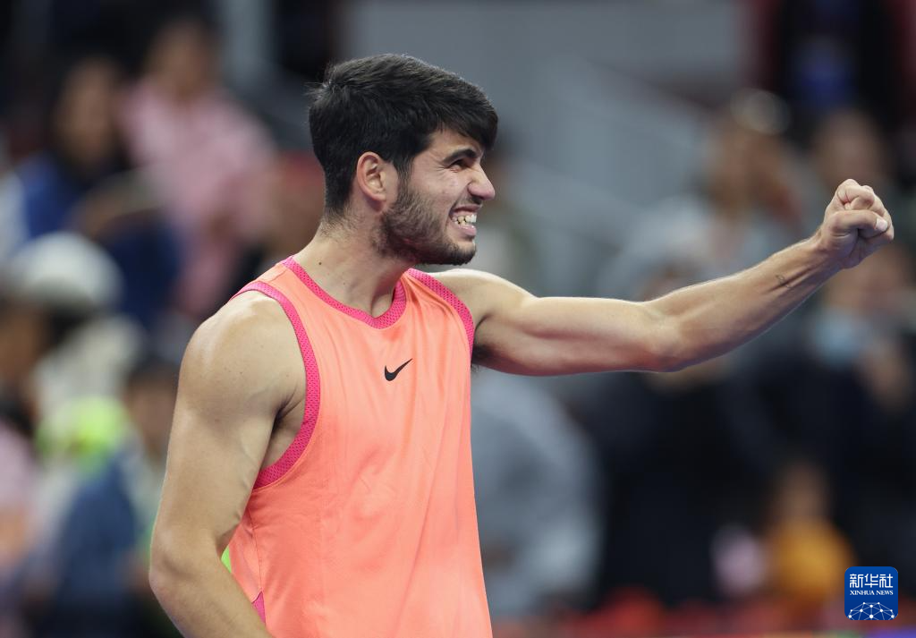 10月2日,阿尔卡拉斯在赛后庆祝胜利。