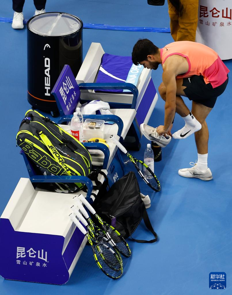 10月2日,阿尔卡拉斯在比赛最后一盘抢七大战中更换球鞋。