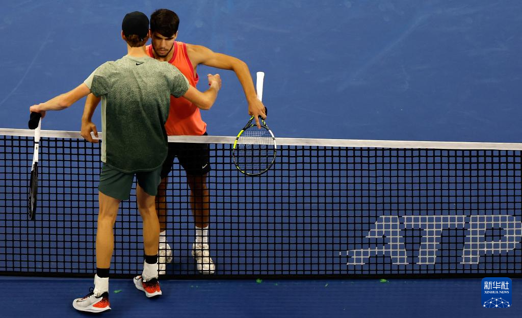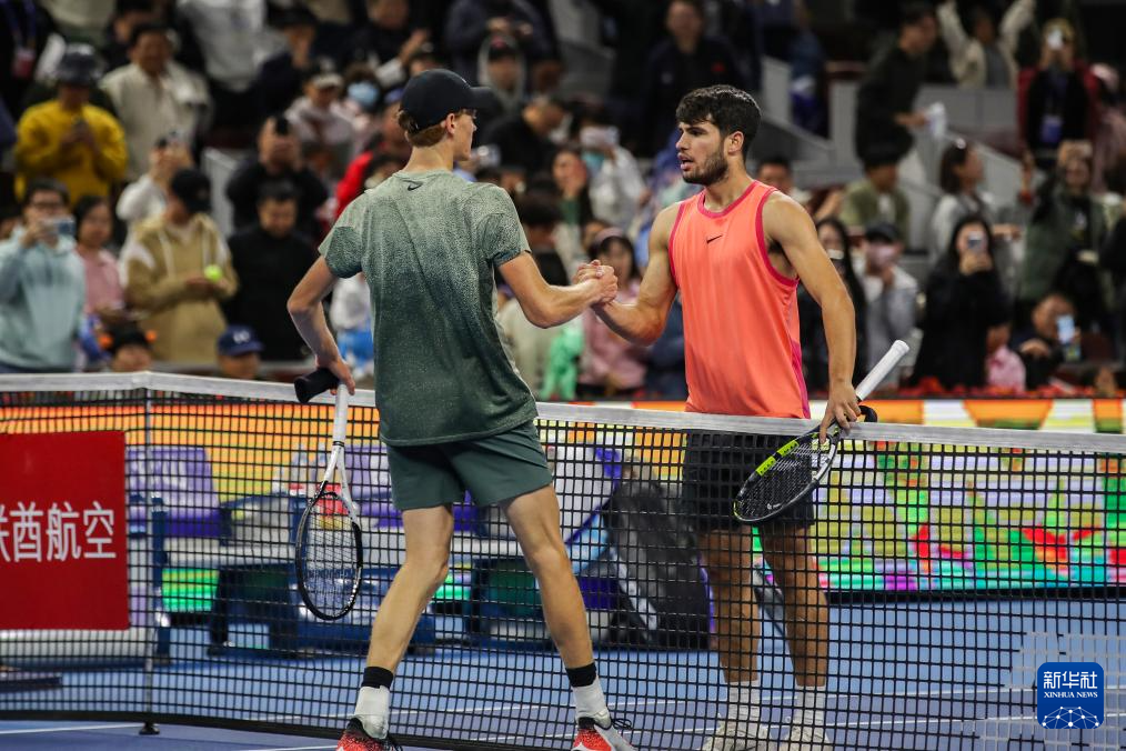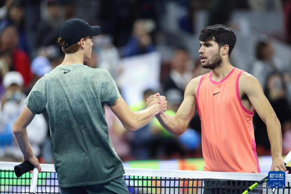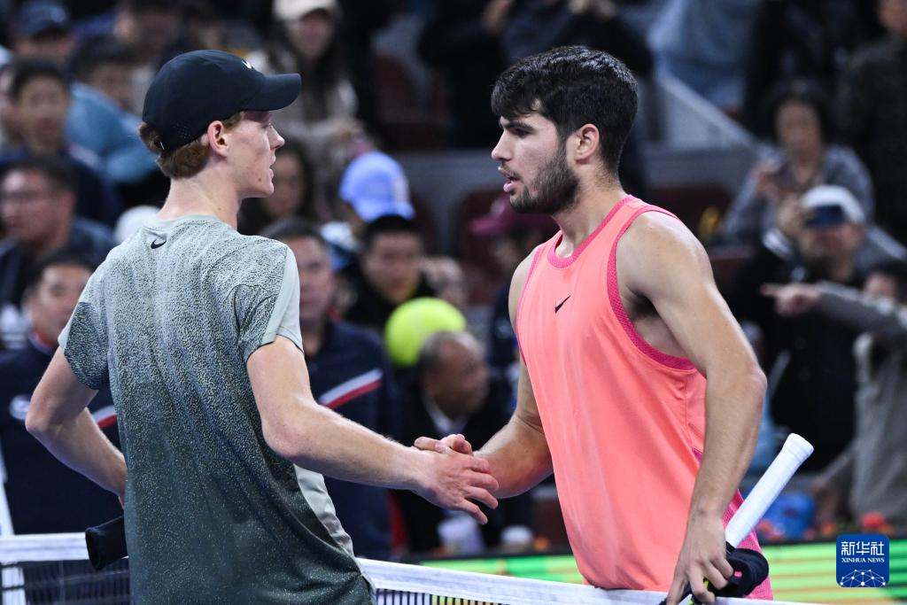 10月2日,阿尔卡拉斯(右)赛后与辛纳握手致意。