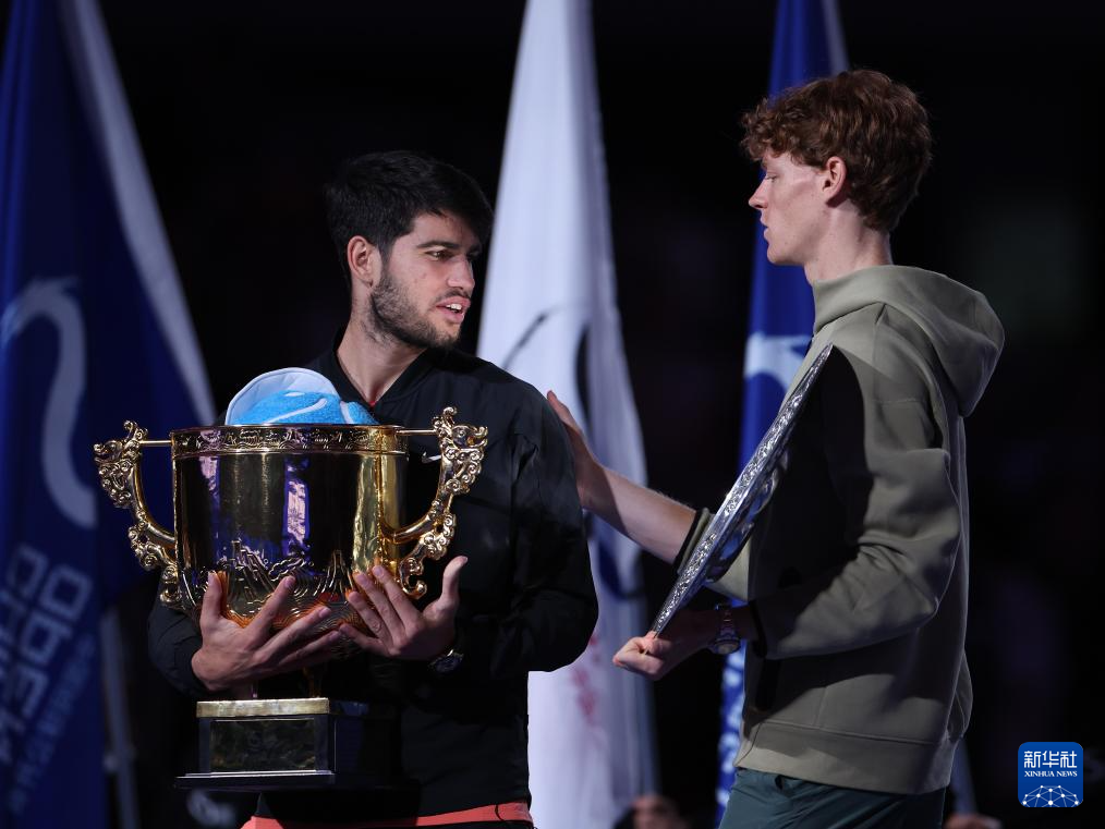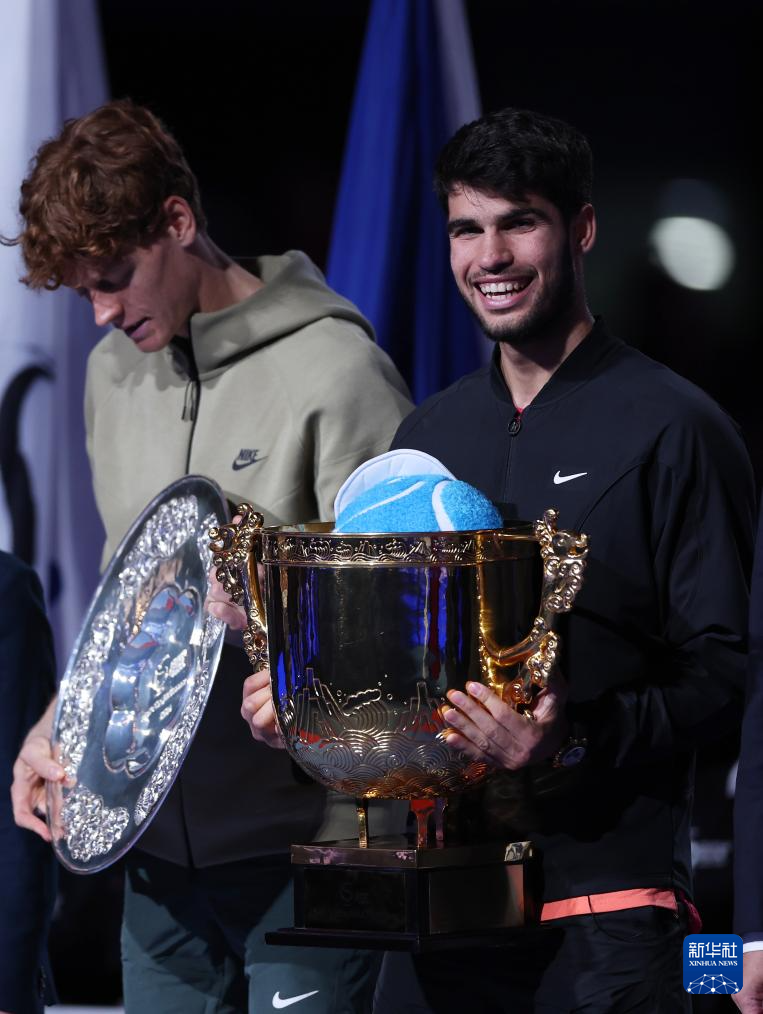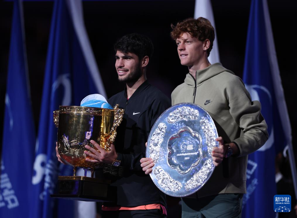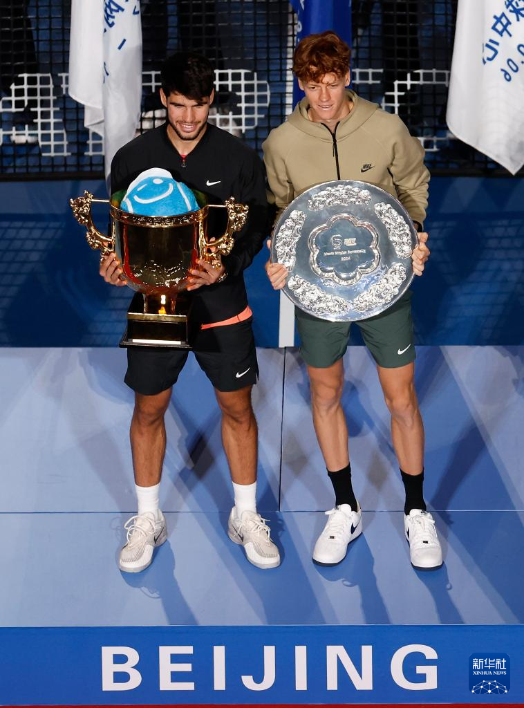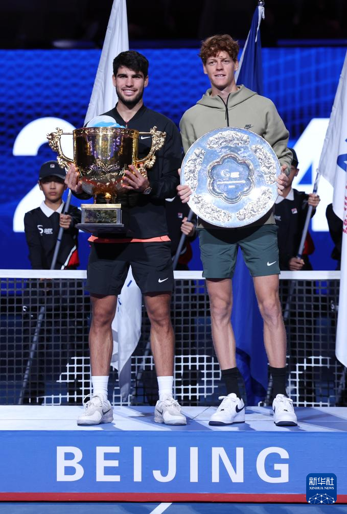 10月2日,阿尔卡拉斯(左)与辛纳在颁奖仪式上。