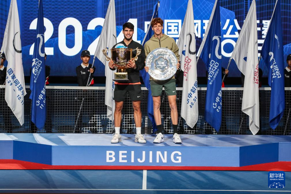 10月2日,阿尔卡拉斯(左)和辛纳在颁奖仪式上。