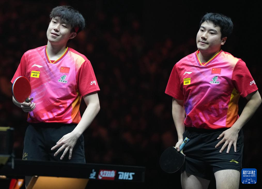 10月2日,王楚钦(左)/梁靖崑在比赛中向对手示意。