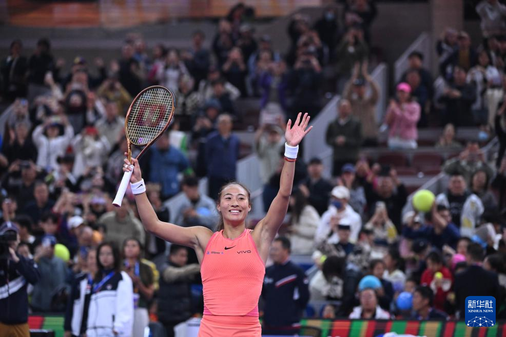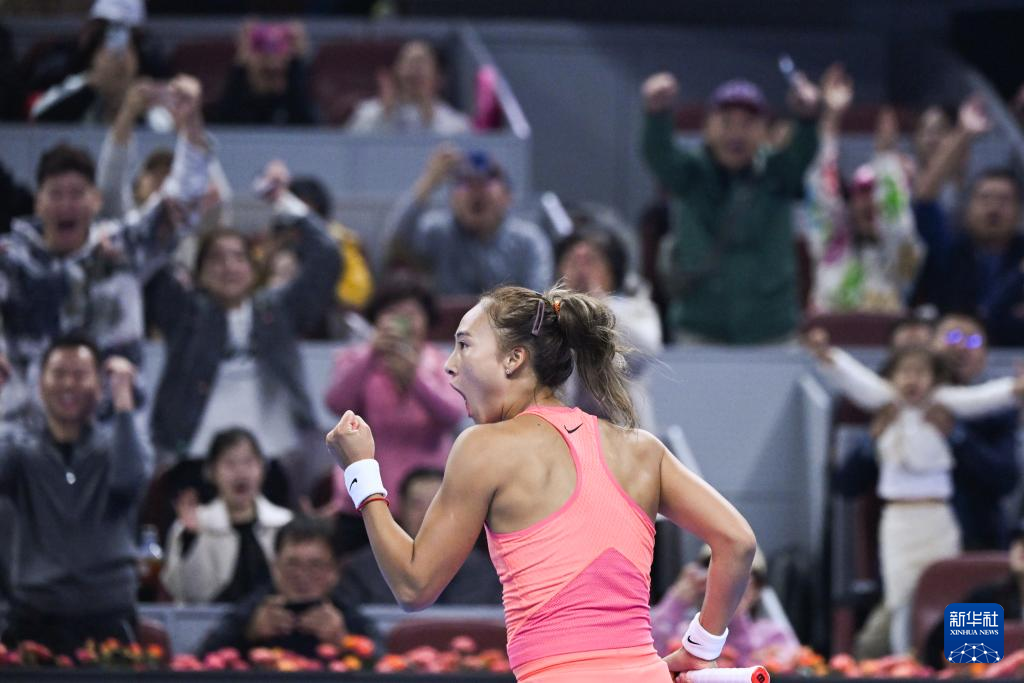 10月4日,郑钦文在赛后庆祝胜利。新华社记者 张龙 摄