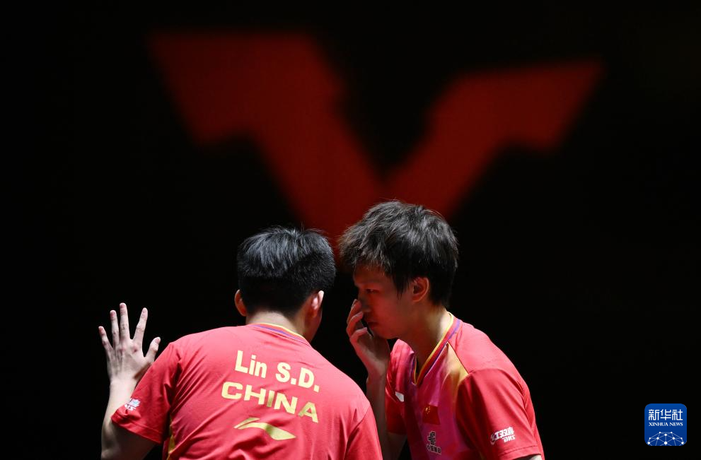 10月4日,林高远(右)/林诗栋在比赛中商讨战术。