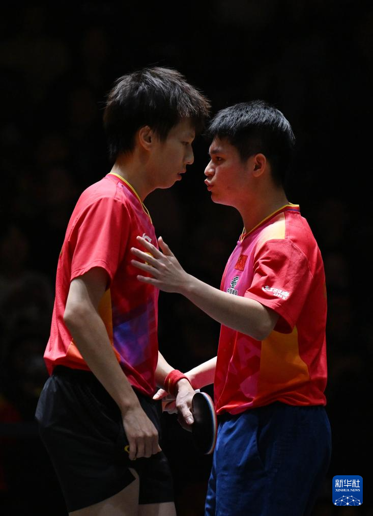 10月4日,林高远(左)/林诗栋在比赛间隙互相鼓励。