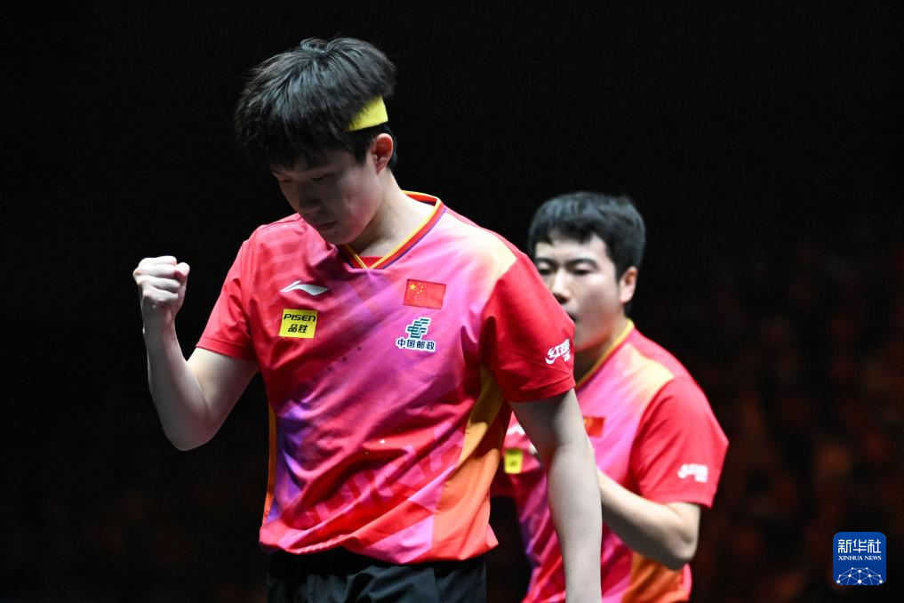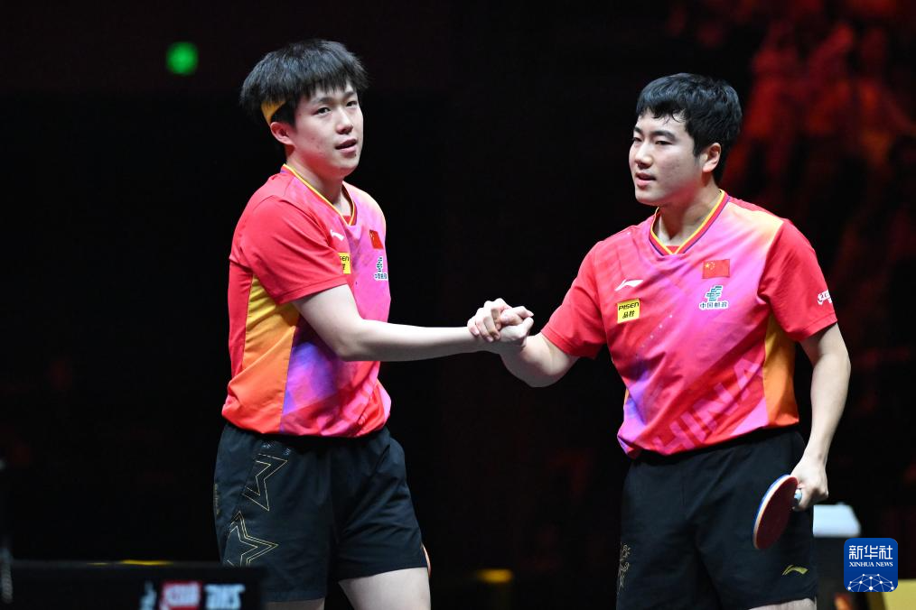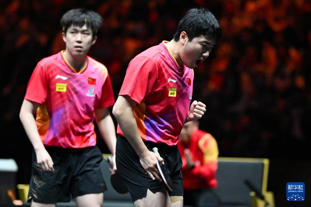 10月4日,王楚钦/梁靖崑(右)在比赛中庆祝。