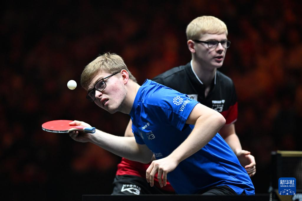 10月4日,王楚钦(中)/梁靖崑(右)在比赛中。
