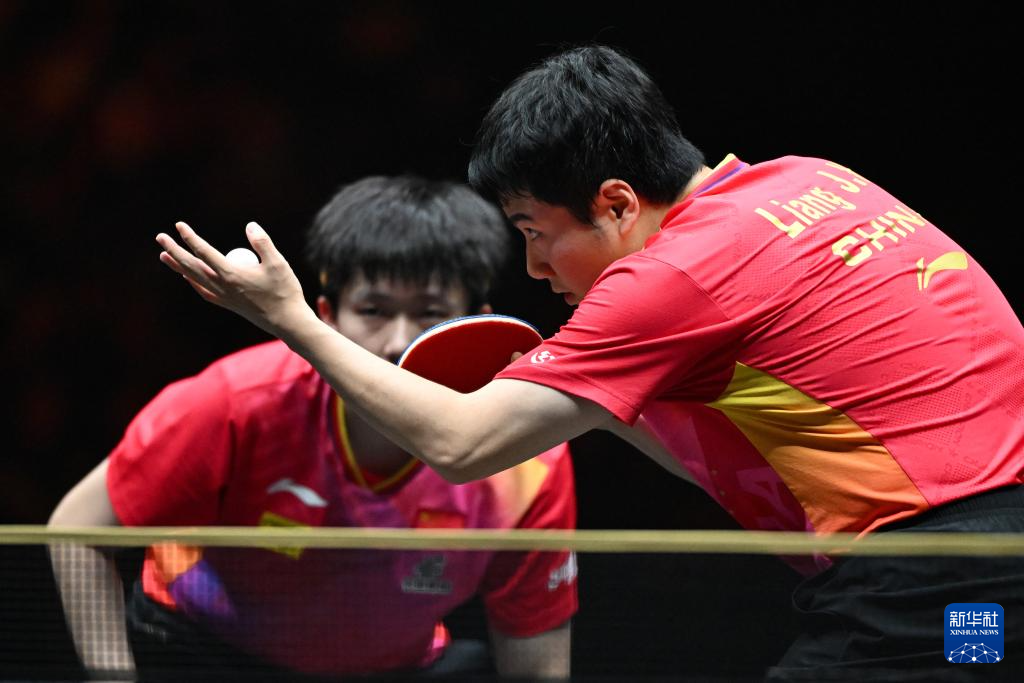 10月4日,王楚钦/梁靖崑(右)在比赛中。