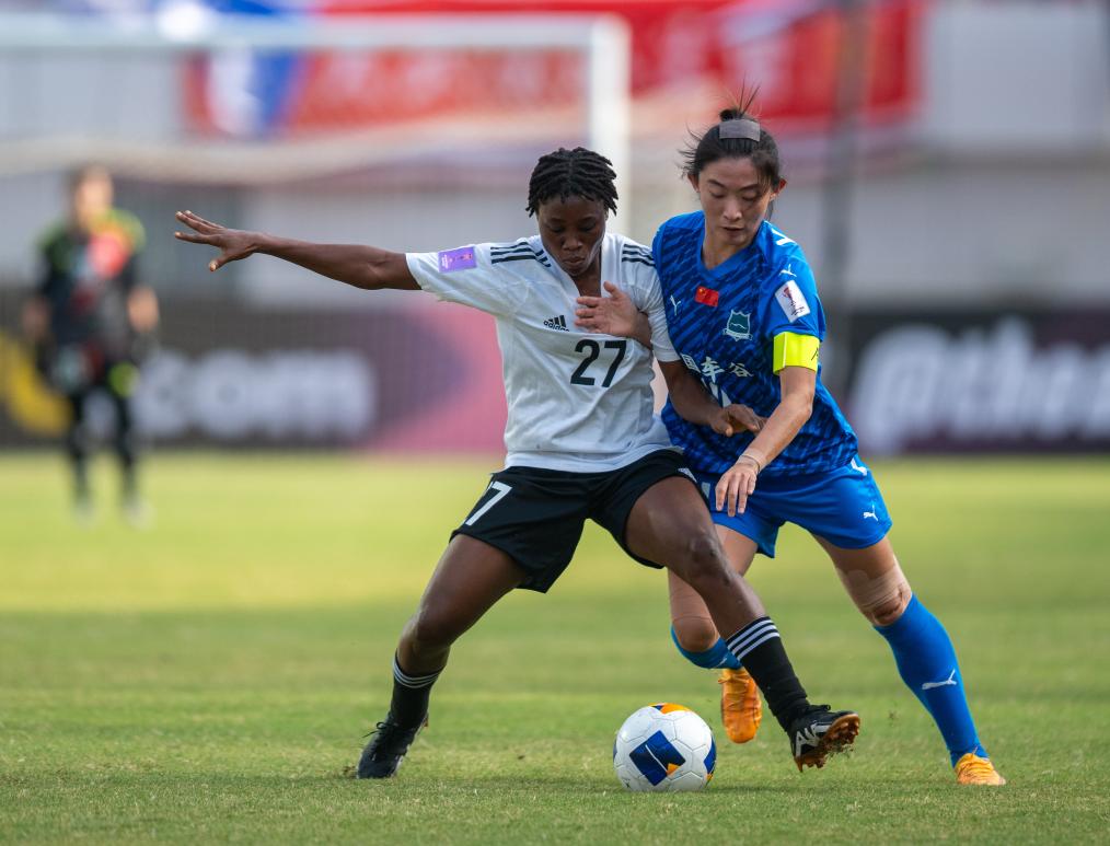 10月3日,武汉车谷江大队球员姚伟(右)与阿布扎比乡村俱乐部队球员拉茜达·易卜拉欣在比赛中拼抢。新华社记者 胡竞文 摄
