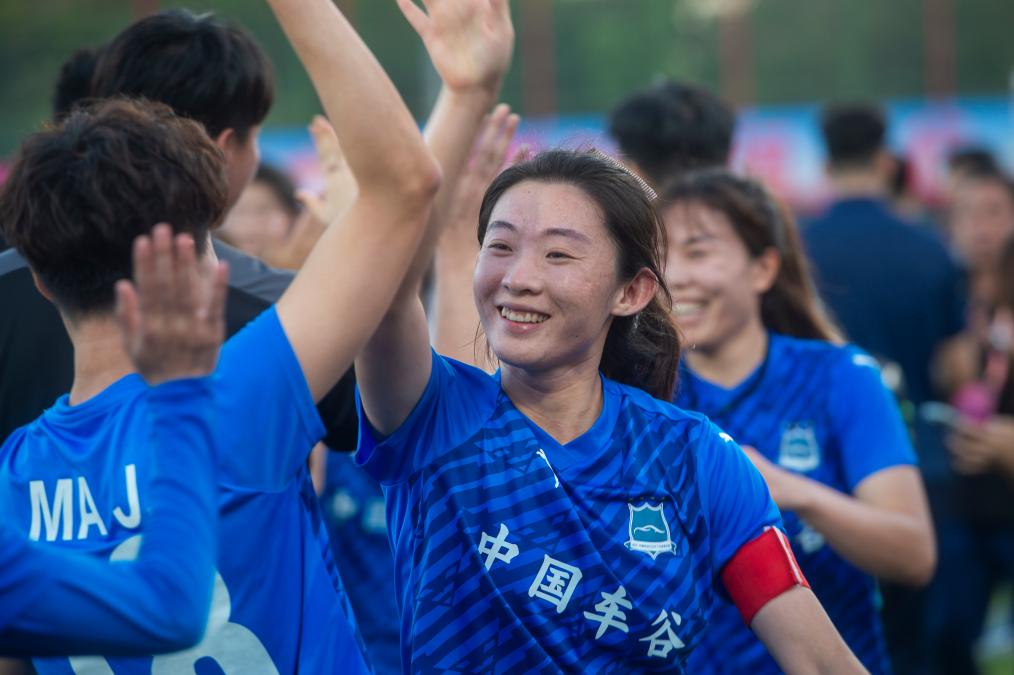 9月28日,武汉车谷江大队球员姚伟(右)在比赛后与队友庆祝。当日,在2024年中国足球协会女子超级联赛第22轮比赛中,武汉车谷江大队1:0战胜陕西志丹队。最终,武汉车谷江大队夺得本赛季女超联赛冠军。新华社记者 伍志尊 摄