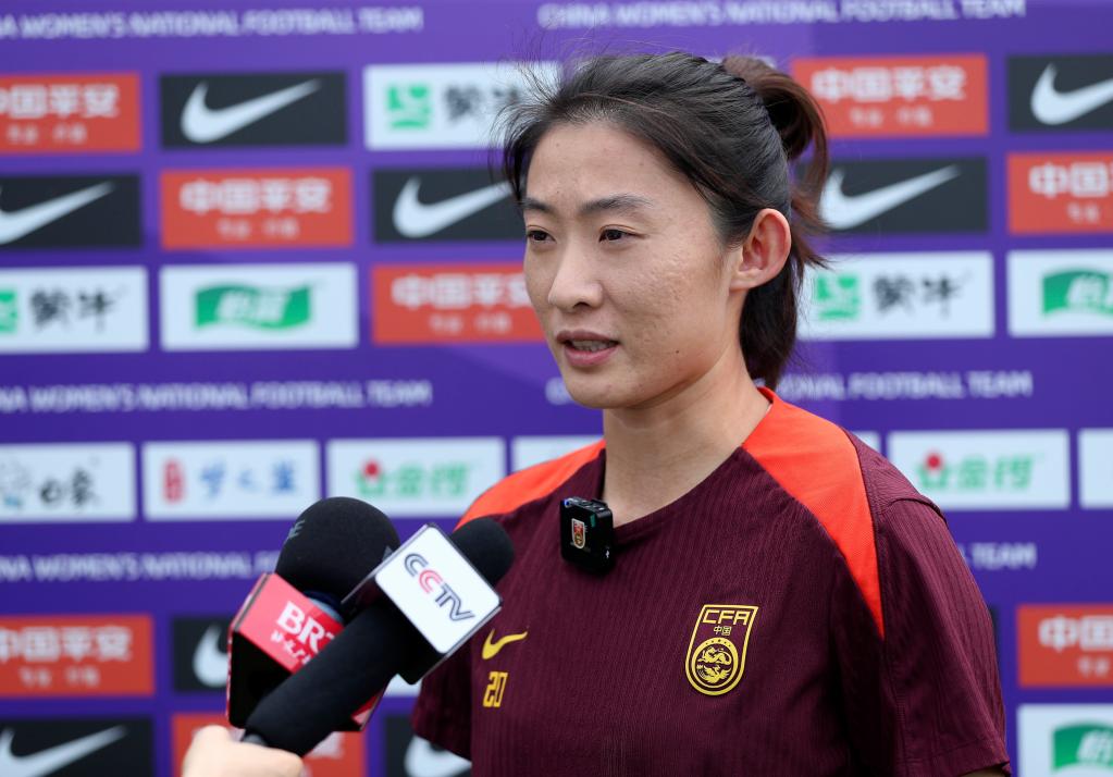 7月13日,中国国家女子足球队球员姚伟在训练前接受媒体采访。当日,中国国家女子足球队在大连足球青训基地举行媒体开放日活动。新华社记者 龙雷 摄