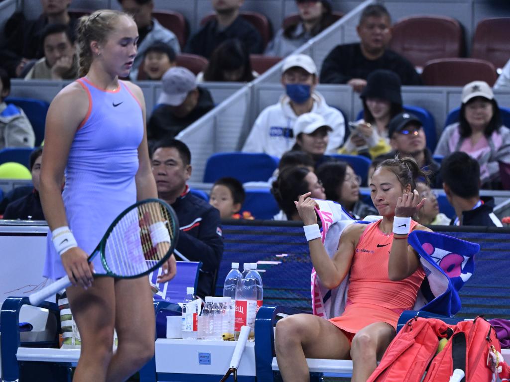 10月4日,郑钦文(右)与安德烈耶娃在比赛间隙。新华社记者 张龙 摄