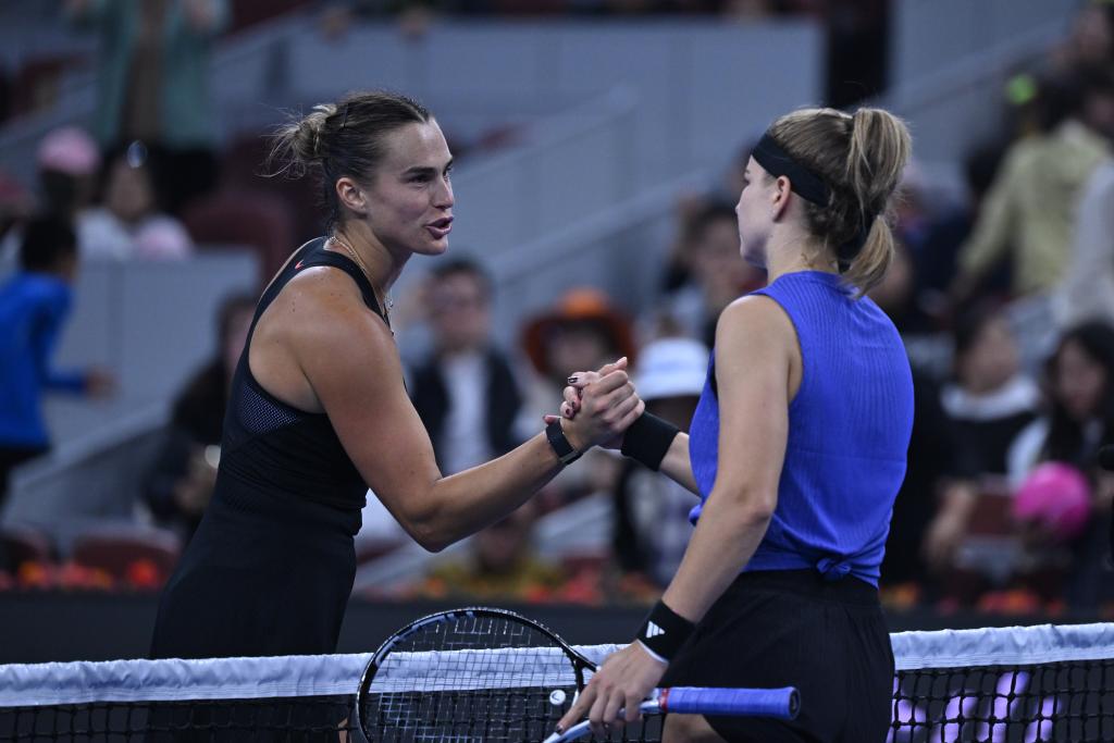 10月4日,萨巴伦卡(左)与穆霍娃在赛后握手致意。新华社记者 张龙 摄