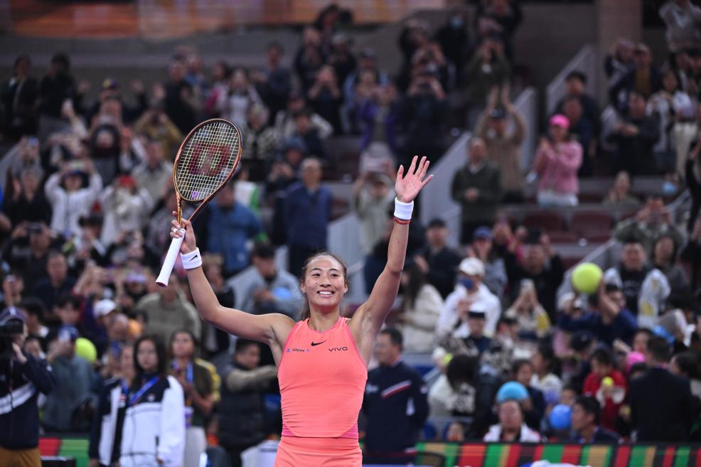 10月4日,郑钦文在赛后庆祝胜利。新华社记者 张龙 摄