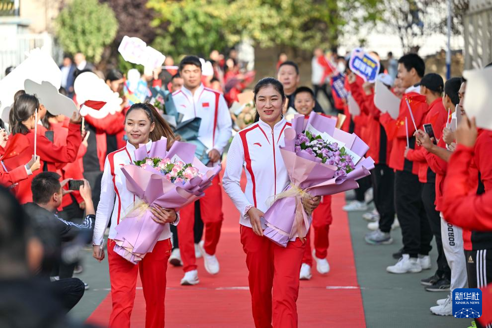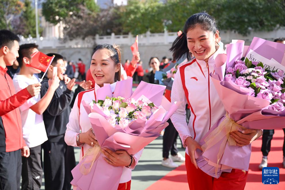 10月4日,常园(前左)、李倩(前右)等运动员走进乌鲁木齐市体育运动学校。