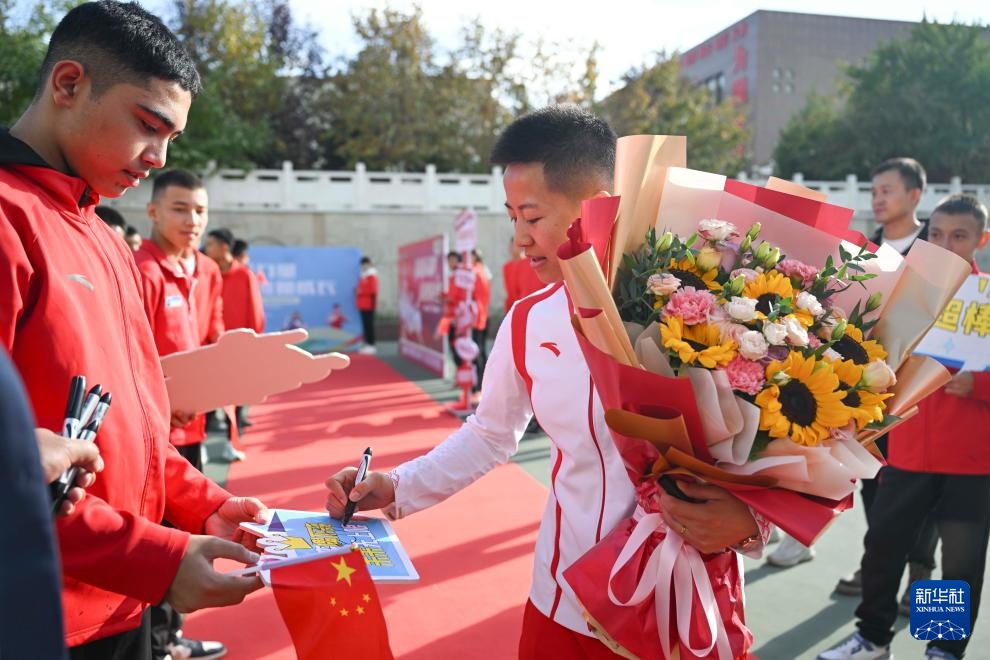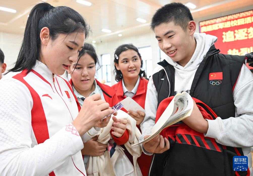10月4日,李倩(左一)为乌鲁木齐市体育运动学校学生签名。