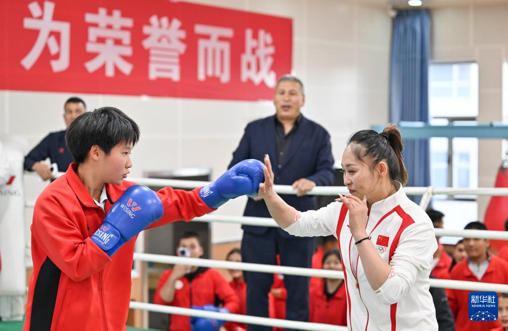 10月4日,李倩(右)和托合塔尔别克·唐拉提汗在乌鲁木齐市体育运动学校拳击馆向学生展示拳击技巧。