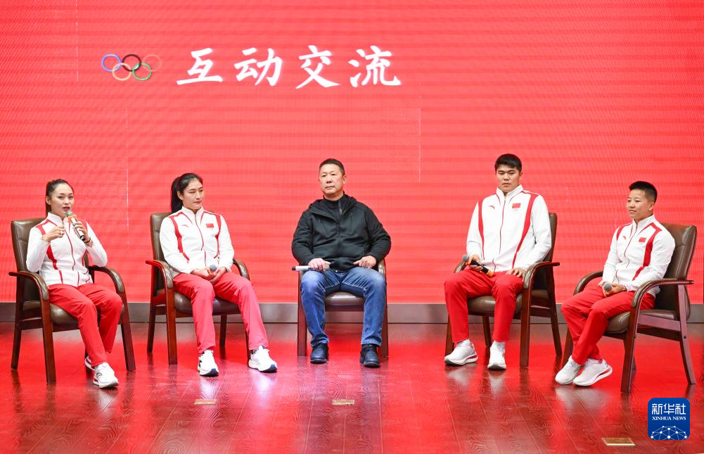10月4日,拳击运动员常园、李倩、白崇光、托合塔尔别克·唐拉提汗、吴愉(从左至右)在交流活动上。