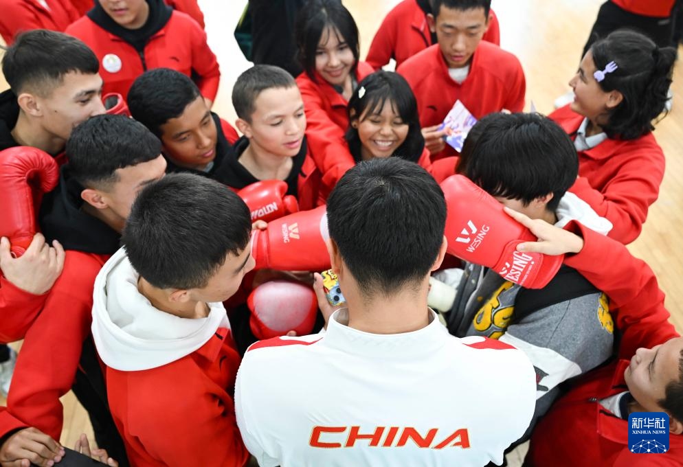 10月4日,吴愉(前右)在乌鲁木齐市体育运动学校拳击馆和学生互动。