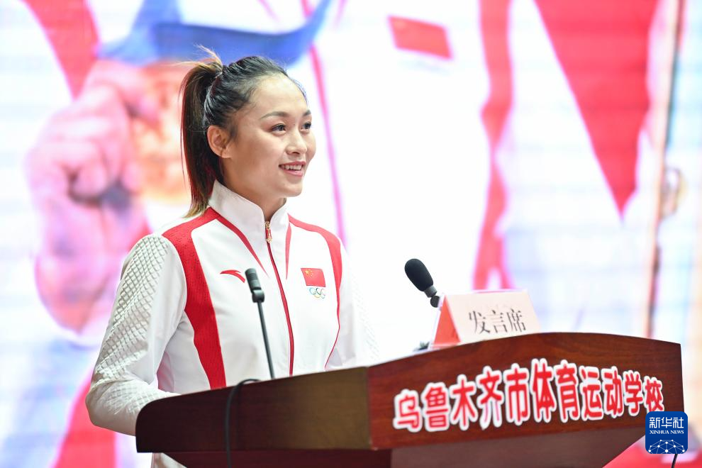 10月4日,吴愉在乌鲁木齐市体育运动学校和学生分享成长经历。