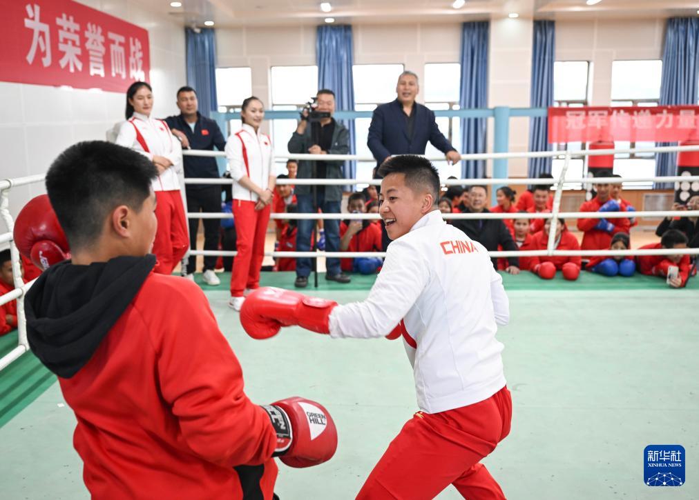 10月4日,常园(右)在乌鲁木齐市体育运动学校拳击馆和学生互动。