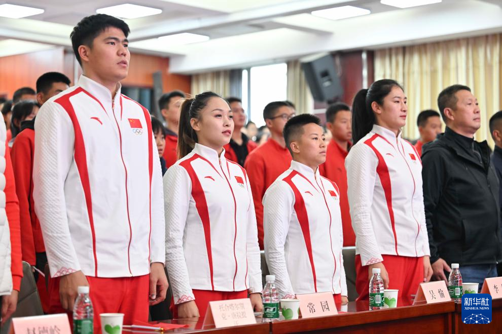 10月4日,拳击运动员托合塔尔别克·唐拉提汗、常园、吴愉、李倩、白崇光(从左至右)在交流活动上与学生们齐唱国歌。