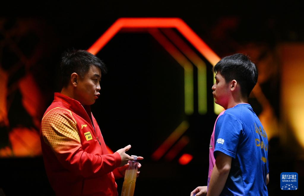10月4日,林诗栋(右)在比赛间隙聆听教练王皓指导。
