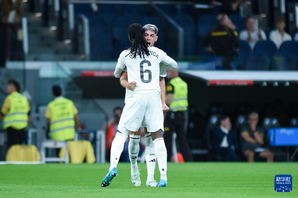 10月5日,皇家马德里队球员卡马文加(前)和巴尔韦德在比赛中庆祝进球。