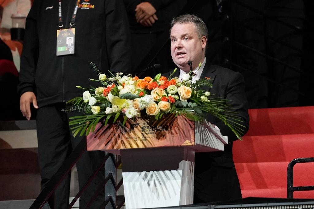9月29日,史蒂夫·丹顿在2024年世界乒乓球职业大联盟(WTT)中国大满贯赛开幕式上致辞。新华社记者 鞠焕宗 摄