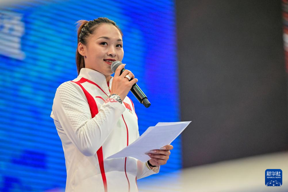 10月9日,巴黎奥运会拳击女子54公斤级冠军常园在比赛前致词。
