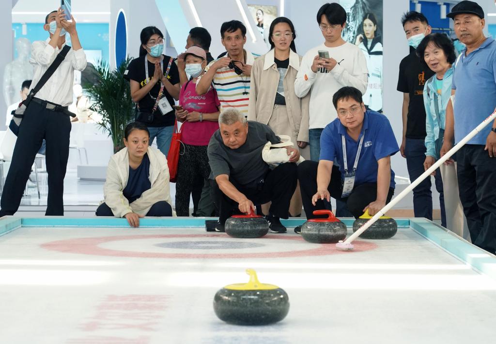这是2023年9月15日拍摄的观众在冬博会现场体验冰壶运动。新华社记者 任超 摄