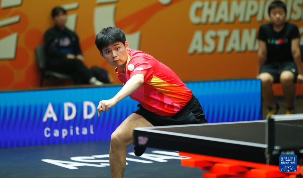 10月10日,中国队选手林诗栋在比赛中回球。最终,他3比1战胜中国台北队选手林昀儒。新华社发(奥斯帕诺夫摄)