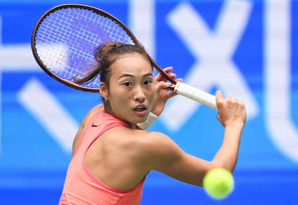 10月10日,郑钦文在比赛中回球。新华社记者 杜子璇 摄